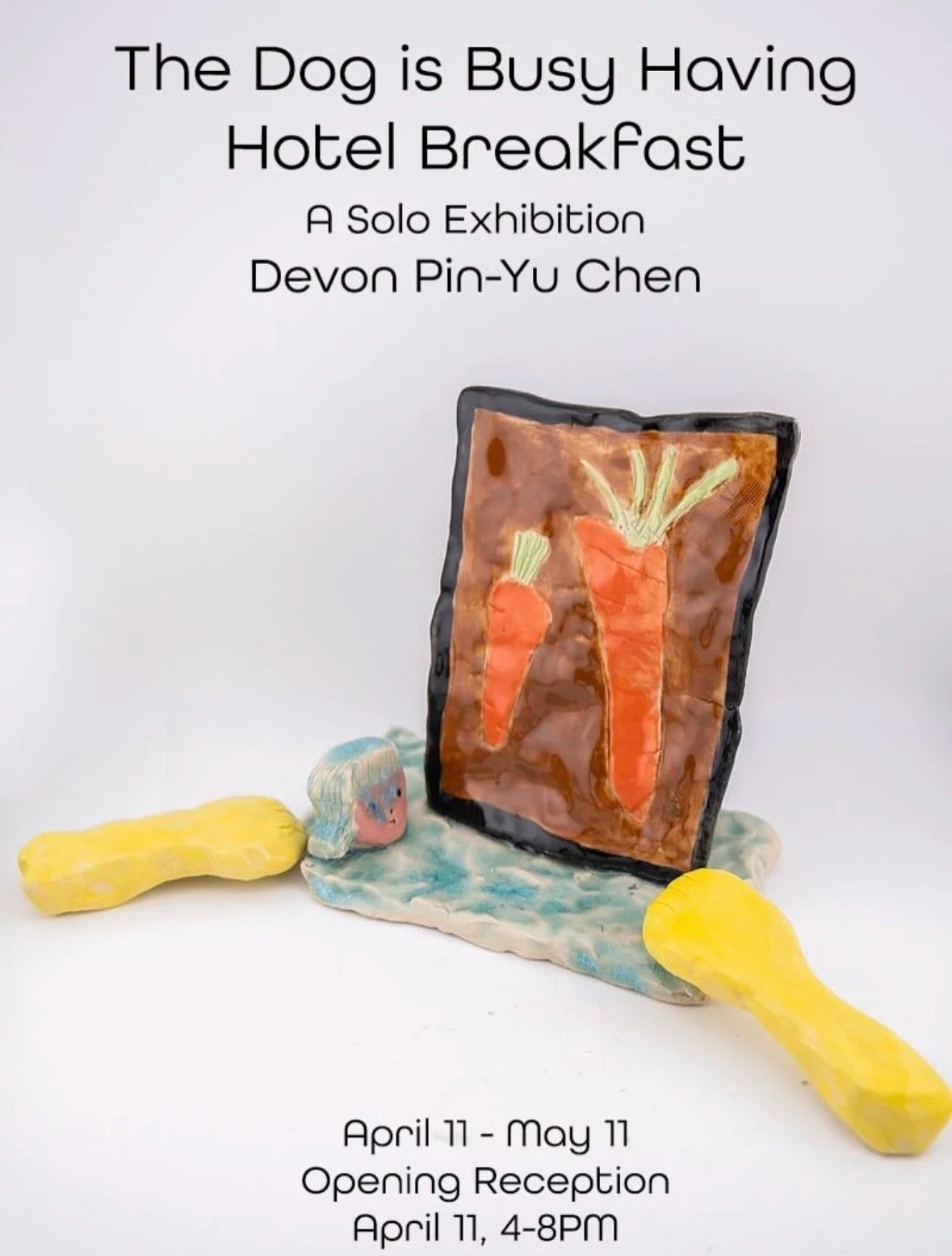 Devon Pin-Yu Chen, a Taiwan-born, New York- based artist, presents The Dog Is Busy Having Hotel Breakfast, a new installation of ceramic sculptures exhibition at All Bout Clay, New York, on view from April 11 to May 11, 2026.